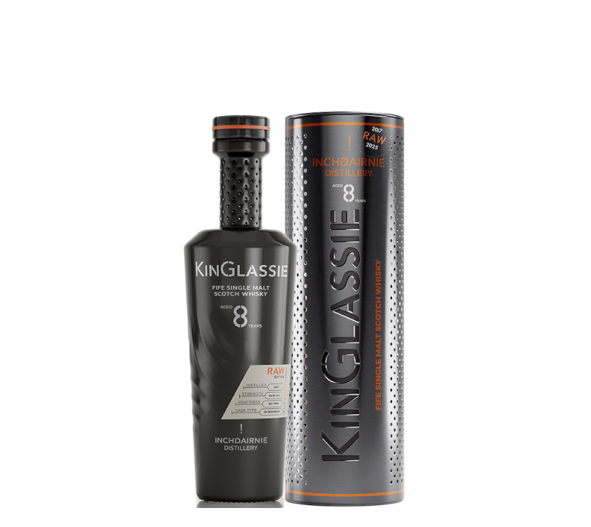 KinGlassie Raw ist ein stark getorfter Fife Single Malt Scotch Whisky, der jährlich für nur zwei Wochen im Winter in der InchDairnie Distillery gebrannt wird. Für seine Herstellung wird ausschließlich Gerstenmalz aus Fife verwendet, das mit Torf vom Festland auf über 50 ppm gemälzt wird. KinGlassie Raw wurde acht Jahre lang in den